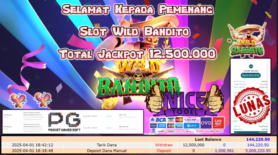 Selamat kepada member NICETOGEL User id :babe** Telah berhasil mendapatkan kemenangan besar pada permainan SLOT WILD BANDITO Dengan kemenangan Sebesar Rp.12.500.000,- Setelah mengisi formulir withdraw dengan kurung waktu hanya 5 – 10 menit pihak NICETOGEL sudah melakukan transfer kepada pemilik Userid dan dana sudah dapat di cairkan oleh pemenang. Bukti pembayaran yang kami berikan merupakan bukti pembayaran yang SAH / VALID yang langung di dapatkan melaui tanda transfer transaksi dari Bank yang di tuju.