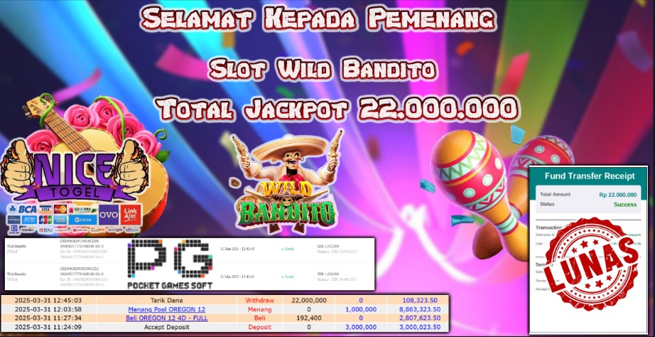 Selamat kepada member NICETOGEL User id :surya** Telah berhasil mendapatkan kemenangan besar pada permainan SLOT WILD BANDITO Dengan kemenangan Sebesar Rp.22.000.000,- Setelah mengisi formulir withdraw dengan kurung waktu hanya 5 – 10 menit pihak NICETOGEL sudah melakukan transfer kepada pemilik Userid dan dana sudah dapat di cairkan oleh pemenang. Bukti pembayaran yang kami berikan merupakan bukti pembayaran yang SAH / VALID yang langung di dapatkan melaui tanda transfer transaksi dari Bank yang di tuju.