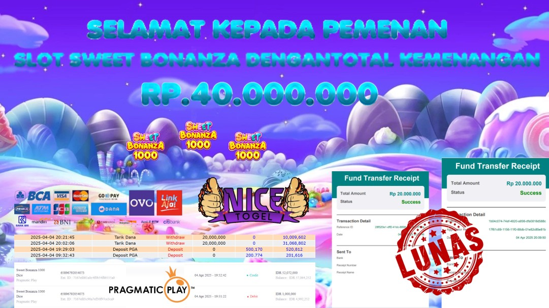 Selamat kepada member NICETOGEL User id :jpadi** Telah berhasil mendapatkan kemenangan besar pada permainan SLOT SWEET BONANZA Dengan kemenangan Sebesar Rp.40.000.000,- Setelah mengisi formulir withdraw dengan kurung waktu hanya 5 – 10 menit pihak NICETOGEL sudah melakukan transfer kepada pemilik Userid dan dana sudah dapat di cairkan oleh pemenang. Bukti pembayaran yang kami berikan merupakan bukti pembayaran yang SAH / VALID yang langung di dapatkan melaui tanda transfer transaksi dari Bank yang di tuju.