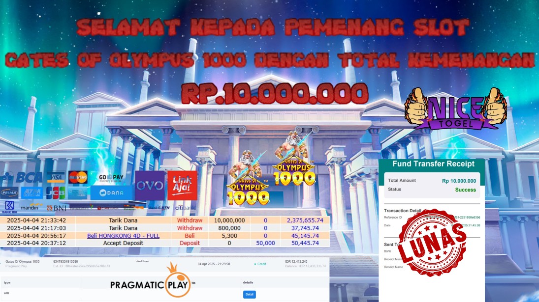Selamat kepada member NICETOGEL User id :Jaka** Telah berhasil mendapatkan kemenangan besar pada permainan SLOT GATES OF OLYMPUS 1000 Dengan kemenangan Sebesar Rp.10.000.000,- Setelah mengisi formulir withdraw dengan kurung waktu hanya 5 – 10 menit pihak NICETOGEL sudah melakukan transfer kepada pemilik Userid dan dana sudah dapat di cairkan oleh pemenang. Bukti pembayaran yang kami berikan merupakan bukti pembayaran yang SAH / VALID yang langung di dapatkan melaui tanda transfer transaksi dari Bank yang di tuju.
