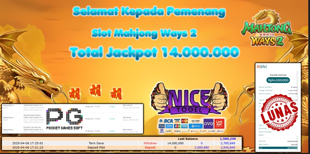 Selamat kepada member NICETOGEL User id :LANI** Telah berhasil mendapatkan kemenangan besar pada permainan SLOT MAHJONG WAYS 2 Dengan kemenangan Sebesar Rp.14.000.000,- Setelah mengisi formulir withdraw dengan kurung waktu hanya 5 – 10 menit pihak NICETOGEL sudah melakukan transfer kepada pemilik Userid dan dana sudah dapat di cairkan oleh pemenang. Bukti pembayaran yang kami berikan merupakan bukti pembayaran yang SAH / VALID yang langung di dapatkan melaui tanda transfer transaksi dari Bank yang di tuju.