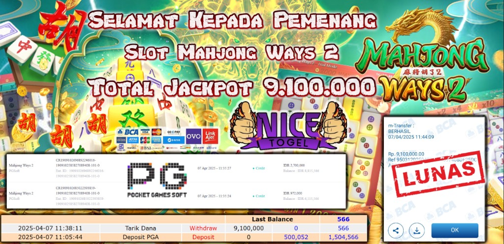 Selamat kepada member NICETOGEL User id :duni** Telah berhasil mendapatkan kemenangan besar pada permainan SLOT MAHJONG WAYS 2 Dengan kemenangan Sebesar Rp.9.100.000,- Setelah mengisi formulir withdraw dengan kurung waktu hanya 5 – 10 menit pihak NICETOGEL sudah melakukan transfer kepada pemilik Userid dan dana sudah dapat di cairkan oleh pemenang. Bukti pembayaran yang kami berikan merupakan bukti pembayaran yang SAH / VALID yang langung di dapatkan melaui tanda transfer transaksi dari Bank yang di tuju.