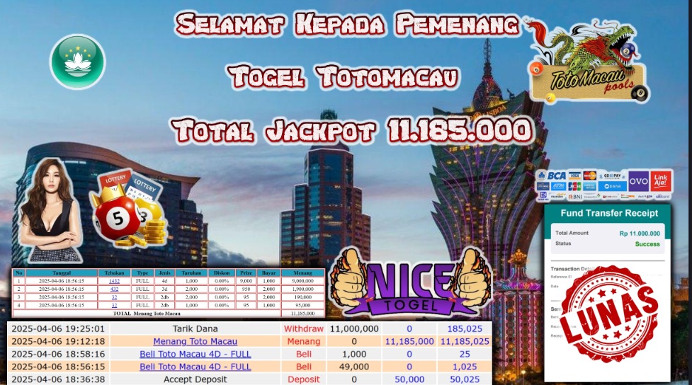 Selamat kepada member NICETOGEL User id :POIN** Telah berhasil mendapatkan kemenangan besar pada permainan TOGEL TOTO MACAU 4D Dengan kemenangan Sebesar Rp.11.185.000,- Setelah mengisi formulir withdraw dengan kurung waktu hanya 5 – 10 menit pihak NICETOGEL sudah melakukan transfer kepada pemilik Userid dan dana sudah dapat di cairkan oleh pemenang. Bukti pembayaran yang kami berikan merupakan bukti pembayaran yang SAH / VALID yang langung di dapatkan melaui tanda transfer transaksi dari Bank yang di tuju.