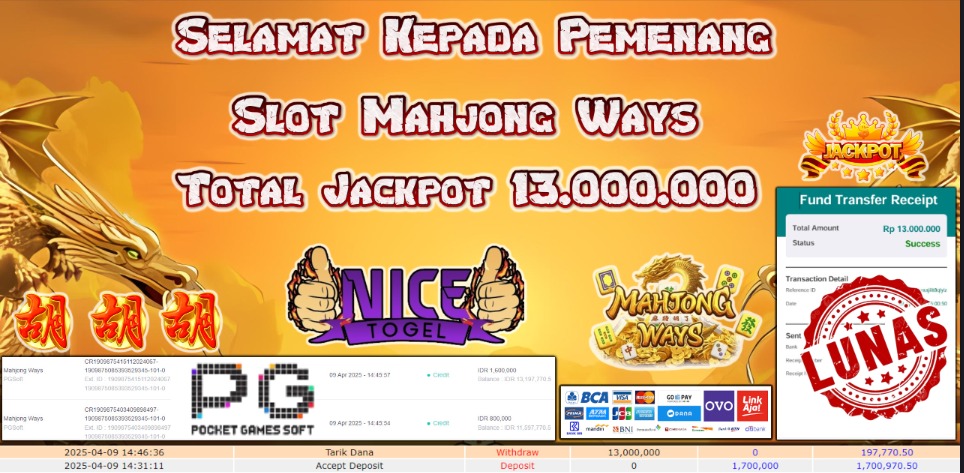 Selamat kepada member NICETOGEL User id :KACAN** Telah berhasil mendapatkan kemenangan besar pada permainan SLOT MAHJONG WAYS Dengan kemenangan Sebesar Rp.13.000.000,- Setelah mengisi formulir withdraw dengan kurung waktu hanya 5 – 10 menit pihak NICETOGEL sudah melakukan transfer kepada pemilik Userid dan dana sudah dapat di cairkan oleh pemenang. Bukti pembayaran yang kami berikan merupakan bukti pembayaran yang SAH / VALID yang langung di dapatkan melaui tanda transfer transaksi dari Bank yang di tuju.