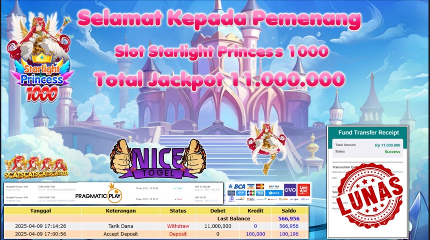 Selamat kepada member NICETOGEL User id :fira** Telah berhasil mendapatkan kemenangan besar pada permainan SLOT STARLIGHT PRINCESS 1000 Dengan kemenangan Sebesar Rp.11.000.000,- Setelah mengisi formulir withdraw dengan kurung waktu hanya 5 – 10 menit pihak NICETOGEL sudah melakukan transfer kepada pemilik Userid dan dana sudah dapat di cairkan oleh pemenang. Bukti pembayaran yang kami berikan merupakan bukti pembayaran yang SAH / VALID yang langung di dapatkan melaui tanda transfer transaksi dari Bank yang di tuju.