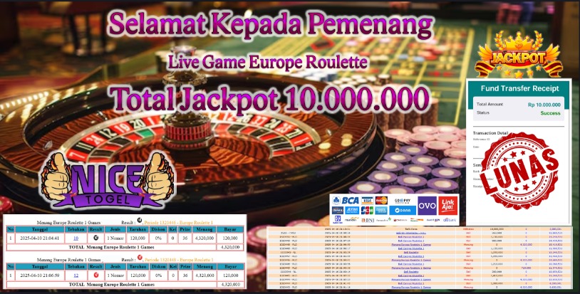 Selamat kepada member NICETOGEL User id :riska** Telah berhasil mendapatkan kemenangan besar pada permainan LIVE GAME EUROPE ROULETTE Dengan kemenangan Sebesar Rp.10.000.000,- Setelah mengisi formulir withdraw dengan kurung waktu hanya 5 – 10 menit pihak NICETOGEL sudah melakukan transfer kepada pemilik Userid dan dana sudah dapat di cairkan oleh pemenang. Bukti pembayaran yang kami berikan merupakan bukti pembayaran yang SAH / VALID yang langung di dapatkan melaui tanda transfer transaksi dari Bank yang di tuju.