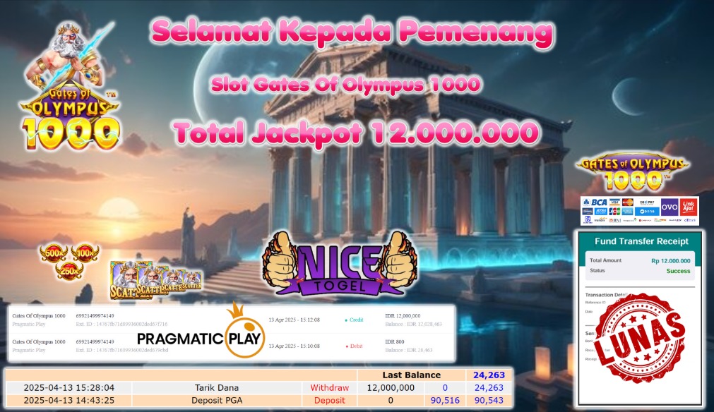 Selamat kepada member NICETOGEL User id :tahi** Telah berhasil mendapatkan kemenangan besar pada permainan SLOT GATES OF OLYMPUS 1000 Dengan kemenangan Sebesar Rp.12.000.000,- Setelah mengisi formulir withdraw dengan kurung waktu hanya 5 – 10 menit pihak NICETOGEL sudah melakukan transfer kepada pemilik Userid dan dana sudah dapat di cairkan oleh pemenang. Bukti pembayaran yang kami berikan merupakan bukti pembayaran yang SAH / VALID yang langung di dapatkan melaui tanda transfer transaksi dari Bank yang di tuju.