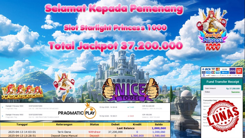 Selamat kepada member NICETOGEL User id :yp55** Telah berhasil mendapatkan kemenangan besar pada permainan SLOT STARLIGHT PRINCESS 1000 Dengan kemenangan Sebesar Rp.37.200.000,- Setelah mengisi formulir withdraw dengan kurung waktu hanya 5 – 10 menit pihak NICETOGEL sudah melakukan transfer kepada pemilik Userid dan dana sudah dapat di cairkan oleh pemenang. Bukti pembayaran yang kami berikan merupakan bukti pembayaran yang SAH / VALID yang langung di dapatkan melaui tanda transfer transaksi dari Bank yang di tuju.