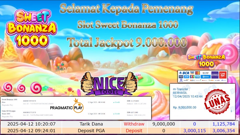 Selamat kepada member NICETOGEL User id :rika** Telah berhasil mendapatkan kemenangan besar pada permainan SLOT SWEET BONANZA 1000 Dengan kemenangan Sebesar Rp.9.000.000,- Setelah mengisi formulir withdraw dengan kurung waktu hanya 5 – 10 menit pihak NICETOGEL sudah melakukan transfer kepada pemilik Userid dan dana sudah dapat di cairkan oleh pemenang. Bukti pembayaran yang kami berikan merupakan bukti pembayaran yang SAH / VALID yang langung di dapatkan melaui tanda transfer transaksi dari Bank yang di tuju.