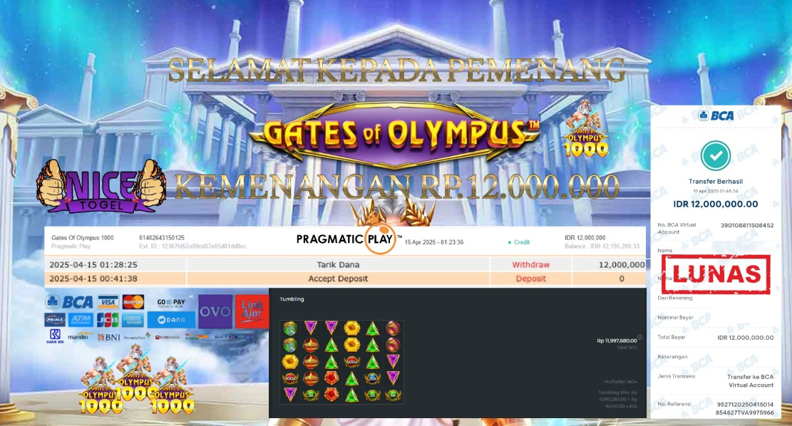 Selamat kepada member NICETOGEL User id :juragan** Telah berhasil mendapatkan kemenangan besar pada permainan SLOT SLOT GATES OF OLYMPUS 1000 Dengan kemenangan Sebesar Rp.12.000.000,- Setelah mengisi formulir withdraw dengan kurung waktu hanya 5 – 10 menit pihak NICETOGEL sudah melakukan transfer kepada pemilik Userid dan dana sudah dapat di cairkan oleh pemenang. Bukti pembayaran yang kami berikan merupakan bukti pembayaran yang SAH / VALID yang langung di dapatkan melaui tanda transfer transaksi dari Bank yang di tuju.