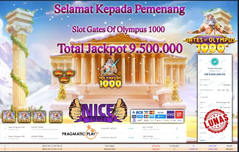 Selamat kepada member NICETOGEL User id :TUAW2** Telah berhasil mendapatkan kemenangan besar pada permainan SLOT GATES OF OLYMPUS 1000 Dengan kemenangan Sebesar Rp.9.500.000,- Setelah mengisi formulir withdraw dengan kurung waktu hanya 5 – 10 menit pihak NICETOGEL sudah melakukan transfer kepada pemilik Userid dan dana sudah dapat di cairkan oleh pemenang. Bukti pembayaran yang kami berikan merupakan bukti pembayaran yang SAH / VALID yang langung di dapatkan melaui tanda transfer transaksi dari Bank yang di tuju.