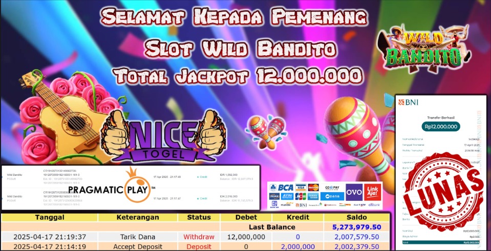 Selamat kepada member NICETOGEL User id :ALOT** Telah berhasil mendapatkan kemenangan besar pada permainan SLOT WILD BANDITO Dengan kemenangan Sebesar Rp.12.000.000,- Setelah mengisi formulir withdraw dengan kurung waktu hanya 5 – 10 menit pihak NICETOGEL sudah melakukan transfer kepada pemilik Userid dan dana sudah dapat di cairkan oleh pemenang. Bukti pembayaran yang kami berikan merupakan bukti pembayaran yang SAH / VALID yang langung di dapatkan melaui tanda transfer transaksi dari Bank yang di tuju.