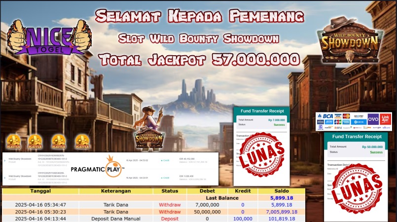 Selamat kepada member NICETOGEL User id :ULIS** Telah berhasil mendapatkan kemenangan besar pada permainan SLOT WILD BOUNTY SHOWDOWN Dengan kemenangan Sebesar Rp.57.000.000,- Setelah mengisi formulir withdraw dengan kurung waktu hanya 5 – 10 menit pihak NICETOGEL sudah melakukan transfer kepada pemilik Userid dan dana sudah dapat di cairkan oleh pemenang. Bukti pembayaran yang kami berikan merupakan bukti pembayaran yang SAH / VALID yang langung di dapatkan melaui tanda transfer transaksi dari Bank yang di tuju.