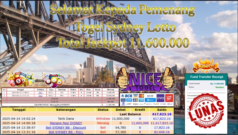 Selamat kepada member NICETOGEL User id :FELLO** Telah berhasil mendapatkan kemenangan besar pada permainan TOGEL SYDNEY LOTTO Dengan kemenangan Sebesar Rp.11.600.000,- Setelah mengisi formulir withdraw dengan kurung waktu hanya 5 – 10 menit pihak NICETOGEL sudah melakukan transfer kepada pemilik Userid dan dana sudah dapat di cairkan oleh pemenang. Bukti pembayaran yang kami berikan merupakan bukti pembayaran yang SAH / VALID yang langung di dapatkan melaui tanda transfer transaksi dari Bank yang di tuju.