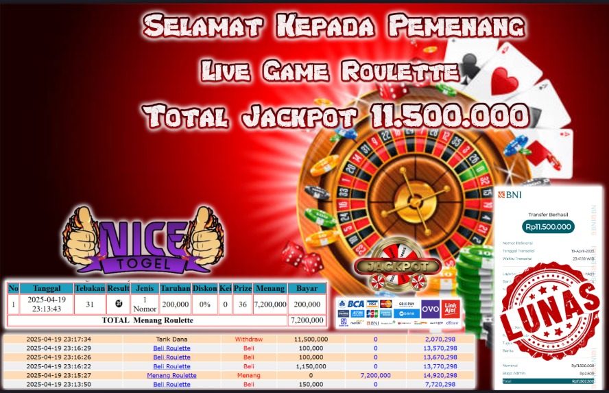 Selamat kepada member NICETOGEL User id :JOGA** Telah berhasil mendapatkan kemenangan besar pada permainan LIVE GAME ROULETTE Dengan kemenangan Sebesar Rp.11.500.000,- Setelah mengisi formulir withdraw dengan kurung waktu hanya 5 – 10 menit pihak NICETOGEL sudah melakukan transfer kepada pemilik Userid dan dana sudah dapat di cairkan oleh pemenang. Bukti pembayaran yang kami berikan merupakan bukti pembayaran yang SAH / VALID yang langung di dapatkan melaui tanda transfer transaksi dari Bank yang di tuju.