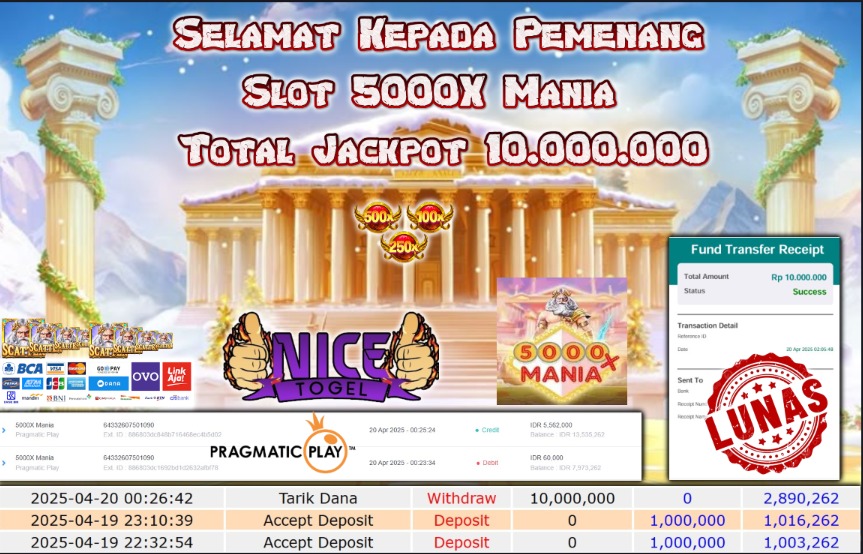 Selamat kepada member NICETOGEL User id :YOUN** Telah berhasil mendapatkan kemenangan besar pada permainan SLOT 5000X MANIA Dengan kemenangan Sebesar Rp.10.000.000,- Setelah mengisi formulir withdraw dengan kurung waktu hanya 5 – 10 menit pihak NICETOGEL sudah melakukan transfer kepada pemilik Userid dan dana sudah dapat di cairkan oleh pemenang. Bukti pembayaran yang kami berikan merupakan bukti pembayaran yang SAH / VALID yang langung di dapatkan melaui tanda transfer transaksi dari Bank yang di tuju.