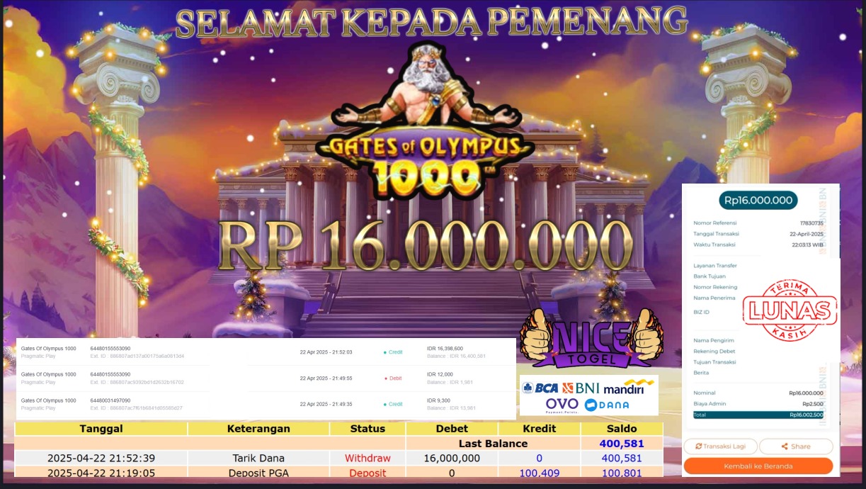 Selamat kepada member NICETOGEL User id :HAKKI** Telah berhasil mendapatkan kemenangan besar pada permainan SLOT GATES OF OLYMPUS 1000 Dengan kemenangan Sebesar Rp.16.000.000,- Setelah mengisi formulir withdraw dengan kurung waktu hanya 5 – 10 menit pihak NICETOGEL sudah melakukan transfer kepada pemilik Userid dan dana sudah dapat di cairkan oleh pemenang. Bukti pembayaran yang kami berikan merupakan bukti pembayaran yang SAH / VALID yang langung di dapatkan melaui tanda transfer transaksi dari Bank yang di tuju.