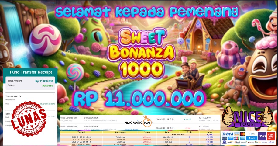 Selamat kepada member NICETOGEL User id :BUD** Telah berhasil mendapatkan kemenangan besar pada permainan SLOT SWEET BONANZA1000 Dengan kemenangan Sebesar Rp.11.000.000,- Setelah mengisi formulir withdraw dengan kurung waktu hanya 5 – 10 menit pihak NICETOGEL sudah melakukan transfer kepada pemilik Userid dan dana sudah dapat di cairkan oleh pemenang. Bukti pembayaran yang kami berikan merupakan bukti pembayaran yang SAH / VALID yang langung di dapatkan melaui tanda transfer transaksi dari Bank yang di tuju.