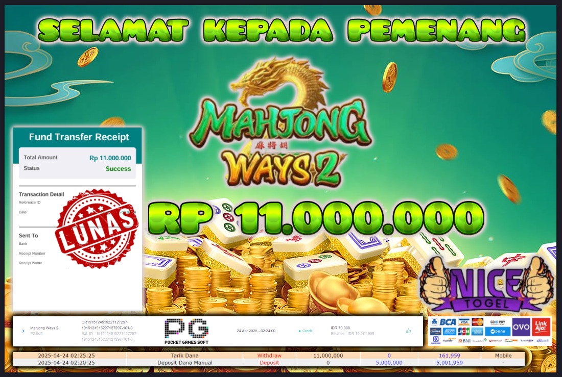 Selamat kepada member NICETOGEL User id :TRIU** Telah berhasil mendapatkan kemenangan besar pada permainan SLOT MAHJONG WAYS 2 Dengan kemenangan Sebesar Rp.11.000.000,- Setelah mengisi formulir withdraw dengan kurung waktu hanya 5 – 10 menit pihak NICETOGEL sudah melakukan transfer kepada pemilik Userid dan dana sudah dapat di cairkan oleh pemenang. Bukti pembayaran yang kami berikan merupakan bukti pembayaran yang SAH / VALID yang langung di dapatkan melaui tanda transfer transaksi dari Bank yang di tuju.