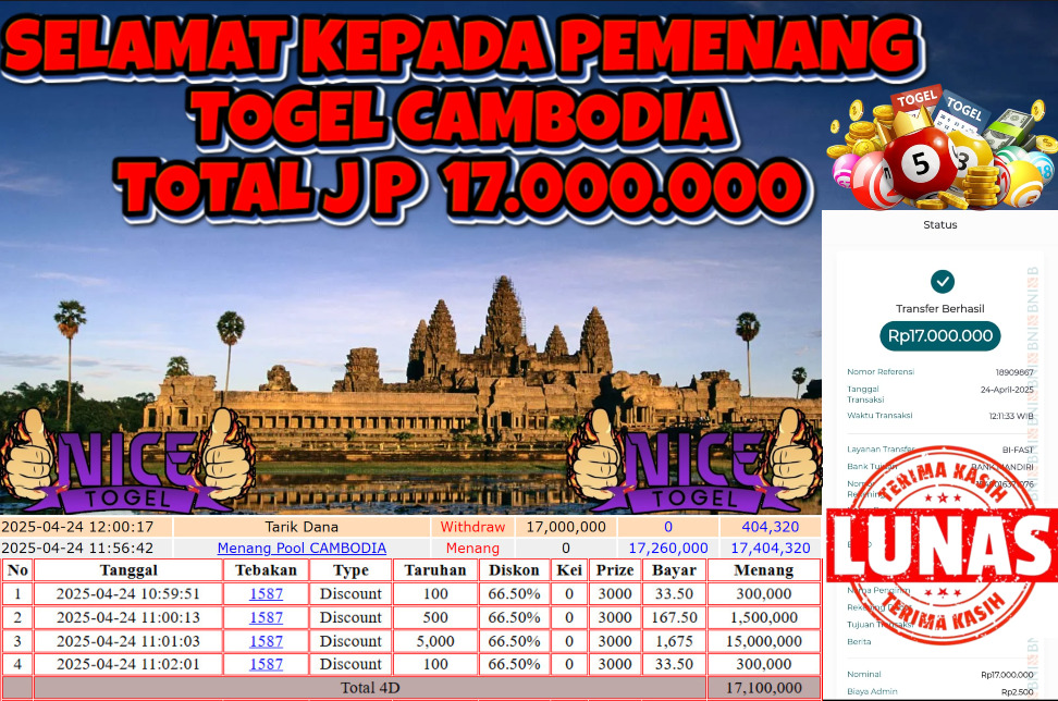 Selamat kepada member NICETOGEL User id :GEEDS** Telah berhasil mendapatkan kemenangan besar pada permainan TOGEL CAMBODIA POOLS Dengan kemenangan Sebesar Rp.17.000.000,- Setelah mengisi formulir withdraw dengan kurung waktu hanya 5 – 10 menit pihak NICETOGEL sudah melakukan transfer kepada pemilik Userid dan dana sudah dapat di cairkan oleh pemenang. Bukti pembayaran yang kami berikan merupakan bukti pembayaran yang SAH / VALID yang langung di dapatkan melaui tanda transfer transaksi dari Bank yang di tuju.
