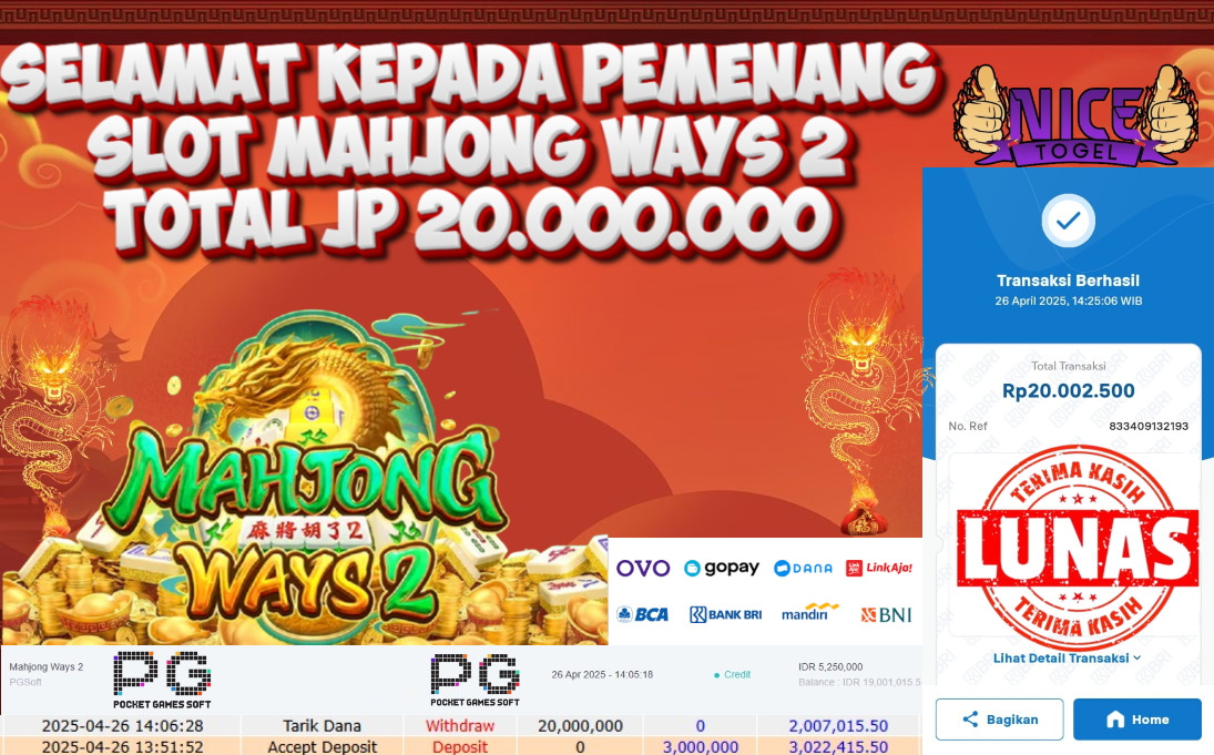 Selamat kepada member NICETOGEL User id :JP548** Telah berhasil mendapatkan kemenangan besar pada permainan SLOT MAHJONG WAYS 2 Dengan kemenangan Sebesar Rp.20.002.500,- Setelah mengisi formulir withdraw dengan kurung waktu hanya 5 – 10 menit pihak NICETOGEL sudah melakukan transfer kepada pemilik Userid dan dana sudah dapat di cairkan oleh pemenang. Bukti pembayaran yang kami berikan merupakan bukti pembayaran yang SAH / VALID yang langung di dapatkan melaui tanda transfer transaksi dari Bank yang di tuju.