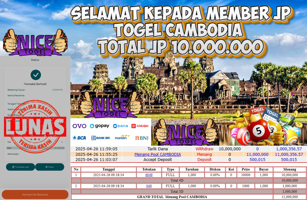 Selamat kepada member NICETOGEL User id :JJPAN** Telah berhasil mendapatkan kemenangan besar pada permainan TOGEL CAMBODIA Dengan kemenangan Sebesar Rp.10.000.000,- Setelah mengisi formulir withdraw dengan kurung waktu hanya 5 – 10 menit pihak NICETOGEL sudah melakukan transfer kepada pemilik Userid dan dana sudah dapat di cairkan oleh pemenang. Bukti pembayaran yang kami berikan merupakan bukti pembayaran yang SAH / VALID yang langung di dapatkan melaui tanda transfer transaksi dari Bank yang di tuju.