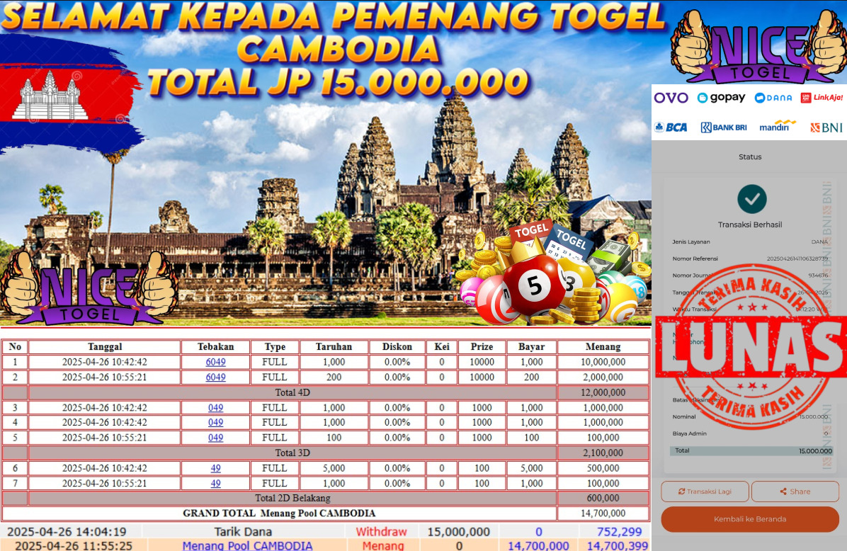 Selamat kepada member NICETOGEL User id :TONI2** Telah berhasil mendapatkan kemenangan besar pada permainan TOGEL CAMBODIA Dengan kemenangan Sebesar Rp.15.000.000,- Setelah mengisi formulir withdraw dengan kurung waktu hanya 5 – 10 menit pihak NICETOGEL sudah melakukan transfer kepada pemilik Userid dan dana sudah dapat di cairkan oleh pemenang. Bukti pembayaran yang kami berikan merupakan bukti pembayaran yang SAH / VALID yang langung di dapatkan melaui tanda transfer transaksi dari Bank yang di tuju.