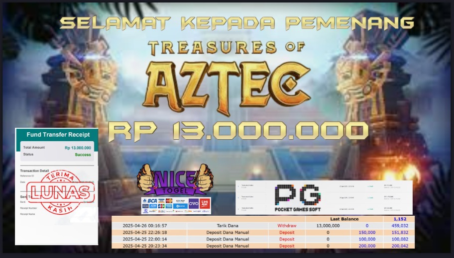 Selamat kepada member NICETOGEL User id :Gear** Telah berhasil mendapatkan kemenangan besar pada permainan SLOT TREASURES OF AZTEC Dengan kemenangan Sebesar Rp.13.000.000,- Setelah mengisi formulir withdraw dengan kurung waktu hanya 5 – 10 menit pihak NICETOGEL sudah melakukan transfer kepada pemilik Userid dan dana sudah dapat di cairkan oleh pemenang. Bukti pembayaran yang kami berikan merupakan bukti pembayaran yang SAH / VALID yang langung di dapatkan melaui tanda transfer transaksi dari Bank yang di tuju.