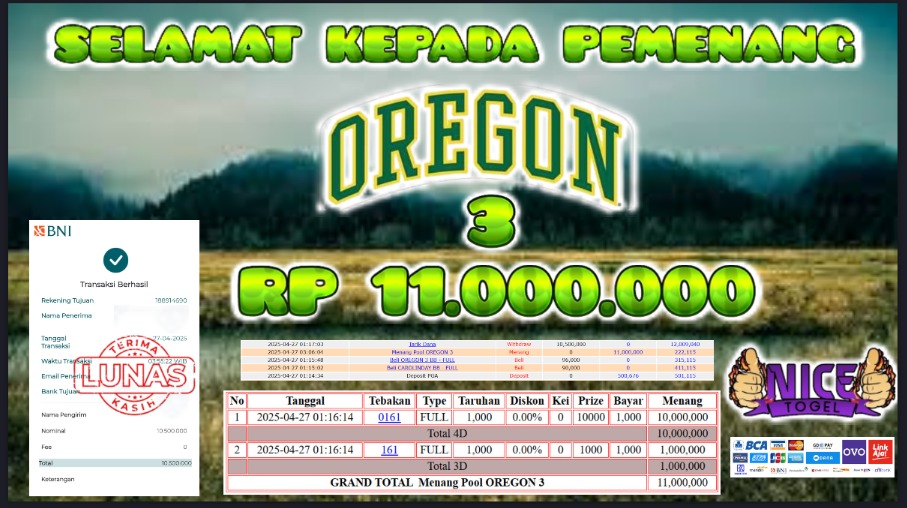 Selamat kepada member NICETOGEL User id :LAMPU** Telah berhasil mendapatkan kemenangan besar pada permainan TOGEL OREGON 3 Dengan kemenangan Sebesar Rp.11.000.000,- Setelah mengisi formulir withdraw dengan kurung waktu hanya 5 – 10 menit pihak NICETOGEL sudah melakukan transfer kepada pemilik Userid dan dana sudah dapat di cairkan oleh pemenang. Bukti pembayaran yang kami berikan merupakan bukti pembayaran yang SAH / VALID yang langung di dapatkan melaui tanda transfer transaksi dari Bank yang di tuju.