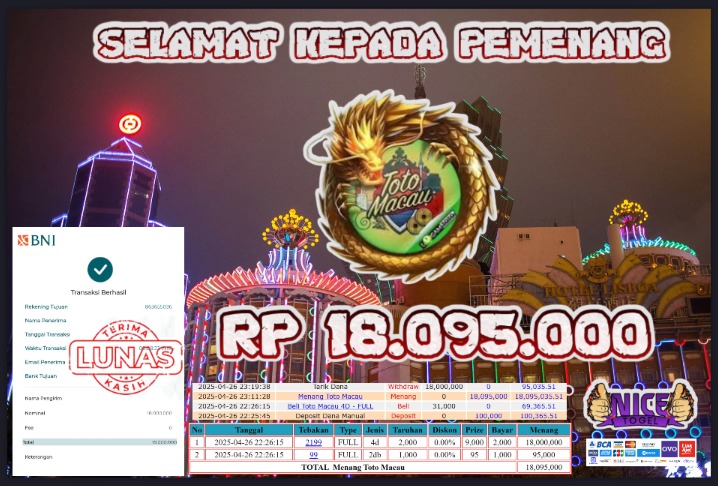 Selamat kepada member NICETOGEL User id :RASYA** Telah berhasil mendapatkan kemenangan besar pada permainan TOGEL TOTO MACAU 4D Dengan kemenangan Sebesar Rp.18.095.000,- Setelah mengisi formulir withdraw dengan kurung waktu hanya 5 – 10 menit pihak NICETOGEL sudah melakukan transfer kepada pemilik Userid dan dana sudah dapat di cairkan oleh pemenang. Bukti pembayaran yang kami berikan merupakan bukti pembayaran yang SAH / VALID yang langung di dapatkan melaui tanda transfer transaksi dari Bank yang di tuju.