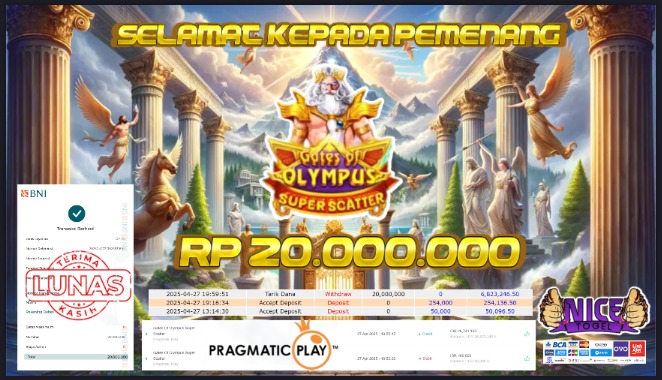 Selamat kepada member NICETOGEL User id :GAE** Telah berhasil mendapatkan kemenangan besar pada permainan SLOT GATES OLYMPUS SUPERSCATTER Dengan kemenangan Sebesar Rp.20.000.000,- Setelah mengisi formulir withdraw dengan kurung waktu hanya 5 – 10 menit pihak NICETOGEL sudah melakukan transfer kepada pemilik Userid dan dana sudah dapat di cairkan oleh pemenang. Bukti pembayaran yang kami berikan merupakan bukti pembayaran yang SAH / VALID yang langung di dapatkan melaui tanda transfer transaksi dari Bank yang di tuju.