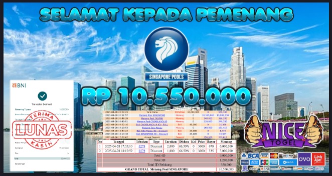 Selamat kepada member NICETOGEL User id :EREAS** Telah berhasil mendapatkan kemenangan besar pada permainan TOGEL SINGAPORE Dengan kemenangan Sebesar Rp.10.550.000,- Setelah mengisi formulir withdraw dengan kurung waktu hanya 5 – 10 menit pihak NICETOGEL sudah melakukan transfer kepada pemilik Userid dan dana sudah dapat di cairkan oleh pemenang. Bukti pembayaran yang kami berikan merupakan bukti pembayaran yang SAH / VALID yang langung di dapatkan melaui tanda transfer transaksi dari Bank yang di tuju.
