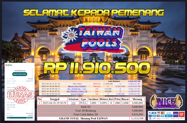 Selamat kepada member NICETOGEL User id :IAE** Telah berhasil mendapatkan kemenangan besar pada permainan TOGEL TAIWAN POOLS Dengan kemenangan Sebesar Rp.11.910.500,- Setelah mengisi formulir withdraw dengan kurung waktu hanya 5 – 10 menit pihak NICETOGEL sudah melakukan transfer kepada pemilik Userid dan dana sudah dapat di cairkan oleh pemenang. Bukti pembayaran yang kami berikan merupakan bukti pembayaran yang SAH / VALID yang langung di dapatkan melaui tanda transfer transaksi dari Bank yang di tuju.