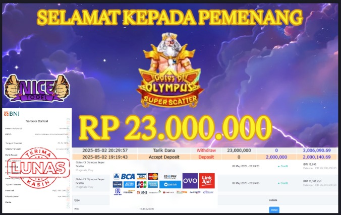 Selamat kepada member NICETOGEL User id :ASRII** Telah berhasil mendapatkan kemenangan besar pada permainan SLOT GATES OF OLYMPUS SUPER SCATTER Dengan kemenangan Sebesar Rp 23.000.000,- Setelah mengisi formulir withdraw dengan kurung waktu hanya 5 – 10 menit pihak NICETOGEL sudah melakukan transfer kepada pemilik Userid dan dana sudah dapat di cairkan oleh pemenang. Bukti pembayaran yang kami berikan merupakan bukti pembayaran yang SAH / VALID yang langung di dapatkan melaui tanda transfer transaksi dari Bank yang di tuju.