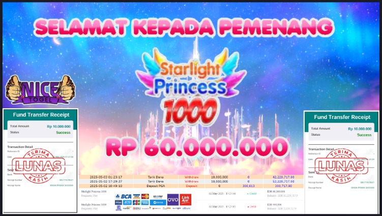 Selamat kepada member NICETOGEL User id :KALIAWI** Telah berhasil mendapatkan kemenangan besar pada permainan SLOT STARLIGHT PRINCESS 1000 Dengan kemenangan Sebesar Rp 60.000.000,- Setelah mengisi formulir withdraw dengan kurung waktu hanya 5 – 10 menit pihak NICETOGEL sudah melakukan transfer kepada pemilik Userid dan dana sudah dapat di cairkan oleh pemenang. Bukti pembayaran yang kami berikan merupakan bukti pembayaran yang SAH / VALID yang langung di dapatkan melaui tanda transfer transaksi dari Bank yang di tuju.