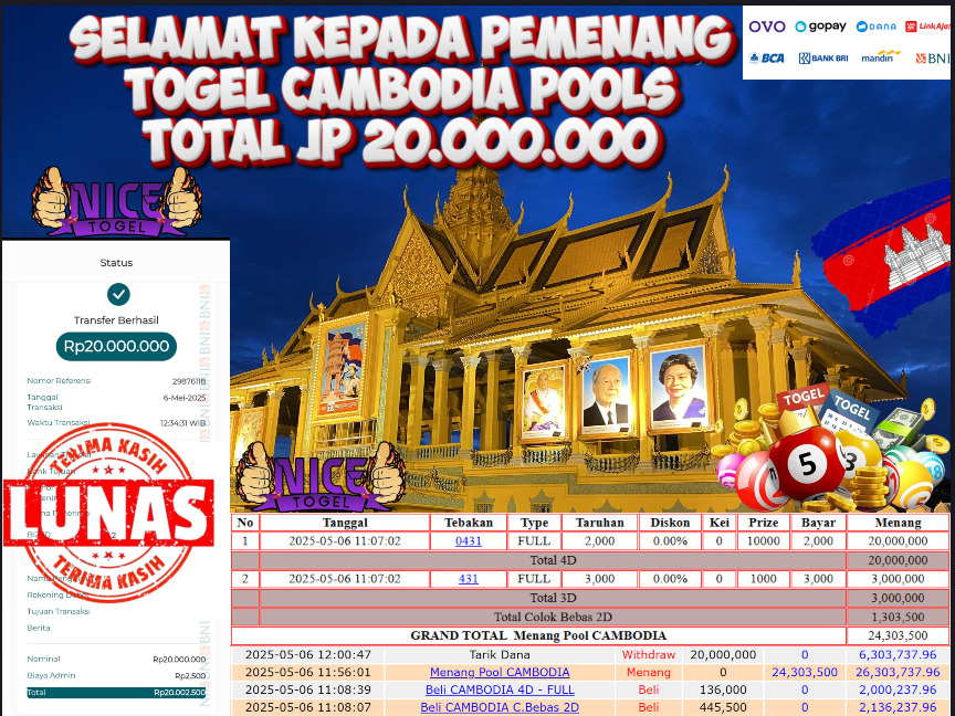 Selamat kepada member NICETOGEL User id :LAMPU** Telah berhasil mendapatkan kemenangan besar pada permainan TOGEL CAMBODIA POOLS Dengan kemenangan Sebesar Rp 20.000.000,- Setelah mengisi formulir withdraw dengan kurung waktu hanya 5 – 10 menit pihak NICETOGEL sudah melakukan transfer kepada pemilik Userid dan dana sudah dapat di cairkan oleh pemenang. Bukti pembayaran yang kami berikan merupakan bukti pembayaran yang SAH / VALID yang langung di dapatkan melaui tanda transfer transaksi dari Bank yang di tuju.