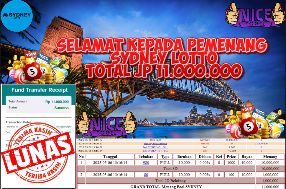 Selamat kepada member NICETOGEL User id :KAKA** Telah berhasil mendapatkan kemenangan besar pada permainan TOGEL SYDNEY LOTTO Dengan kemenangan Sebesar Rp 11.000.000,- Setelah mengisi formulir withdraw dengan kurung waktu hanya 5 – 10 menit pihak NICETOGEL sudah melakukan transfer kepada pemilik Userid dan dana sudah dapat di cairkan oleh pemenang. Bukti pembayaran yang kami berikan merupakan bukti pembayaran yang SAH / VALID yang langung di dapatkan melaui tanda transfer transaksi dari Bank yang di tuju.