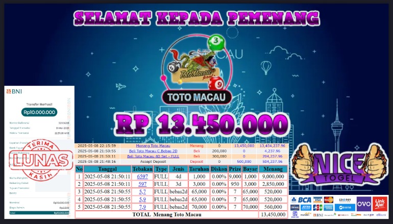 Selamat kepada member NICETOGEL User id : RARW** Telah berhasil mendapatkan kemenangan besar pada permainan TOGEL TOTO MACAU Dengan kemenangan Sebesar Rp.13.450.000,- Setelah mengisi formulir withdraw dengan kurung waktu hanya 5 – 10 menit pihak NICETOGEL sudah melakukan transfer kepada pemilik Userid dan dana sudah dapat di cairkan oleh pemenang. Bukti pembayaran yang kami berikan merupakan bukti pembayaran yang SAH / VALID yang langung di dapatkan melaui tanda transfer transaksi dari Bank yang di tuju.