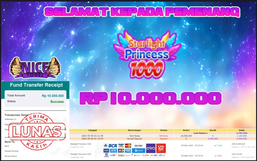 Selamat kepada member NICETOGEL User id :TRAI** Telah berhasil mendapatkan kemenangan besar pada permainan SLOT STARLIGHT PRINCESS 1000 Dengan kemenangan Sebesar Rp 10.000.000,- Setelah mengisi formulir withdraw dengan kurung waktu hanya 5 – 10 menit pihak NICETOGEL sudah melakukan transfer kepada pemilik Userid dan dana sudah dapat di cairkan oleh pemenang. Bukti pembayaran yang kami berikan merupakan bukti pembayaran yang SAH / VALID yang langung di dapatkan melaui tanda transfer transaksi dari Bank yang di tuju.