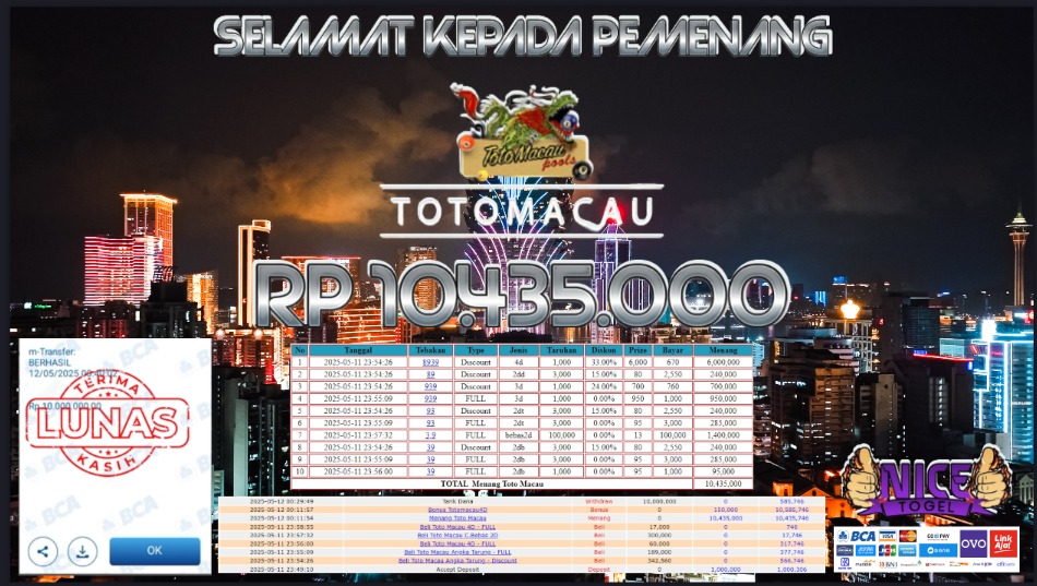 Selamat kepada member NICETOGEL User id : WRA** Telah berhasil mendapatkan kemenangan besar pada permainan TOGEL TOTO MACAU Dengan kemenangan Sebesar Rp.10.435.000,- Setelah mengisi formulir withdraw dengan kurung waktu hanya 5 – 10 menit pihak NICETOGEL sudah melakukan transfer kepada pemilik Userid dan dana sudah dapat di cairkan oleh pemenang. Bukti pembayaran yang kami berikan merupakan bukti pembayaran yang SAH / VALID yang langung di dapatkan melaui tanda transfer transaksi dari Bank yang di tuju.
