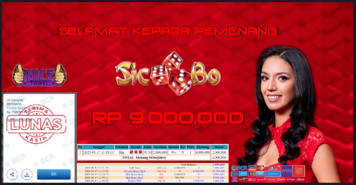 Selamat kepada User id : KIM* Telah berhasil mendapatkan kemenangan besar pada permainan LIVE MEGA SICBO Dengan kemenangan Sebesar Rp.9.000.000,- Setelah mengisi formulir withdraw dengan kurung waktu hanya 5 – 10 menit pihak NICETOGEL sudah melakukan transfer kepada pemilik Userid dan dana sudah dapat di cairkan oleh pemenang. Bukti pembayaran yang kami berikan merupakan bukti pembayaran yang SAH / VALID yang langung di dapatkan melaui tanda transfer transaksi dari Bank yang di tuju.