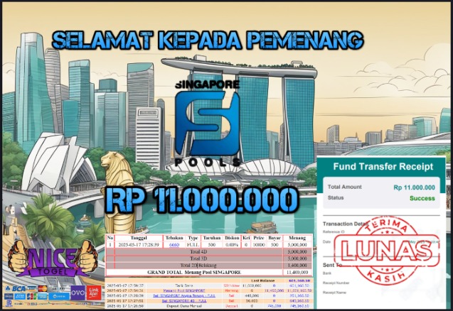 Selamat kepada member NICETOGEL User id :KDH** Telah berhasil mendapatkan kemenangan besar pada permainan TOGEL SINGAPORE Dengan kemenangan Sebesar Rp.11.000.000,- Setelah mengisi formulir withdraw dengan kurung waktu hanya 5 – 10 menit pihak NICETOGEL sudah melakukan transfer kepada pemilik Userid dan dana sudah dapat di cairkan oleh pemenang. Bukti pembayaran yang kami berikan merupakan bukti pembayaran yang SAH / VALID yang langung di dapatkan melaui tanda transfer transaksi dari Bank yang di tuju.
