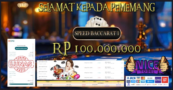 selamat kepada User id : KEM* Telah berhasil mendapatkan kemenangan besar pada permainan LIVE GAMES CHINESE SPEED BACARAT 1 Dengan kemenangan Sebesar Rp.100.000.000,- Setelah mengisi formulir withdraw dengan kurung waktu hanya 5 – 10 menit pihak NICETOGEL sudah melakukan transfer kepada pemilik Userid dan dana sudah dapat di cairkan oleh pemenang. Bukti pembayaran yang kami berikan merupakan bukti pembayaran yang SAH / VALID yang langung di dapatkan melaui tanda transfer transaksi dari Bank yang di tuju.