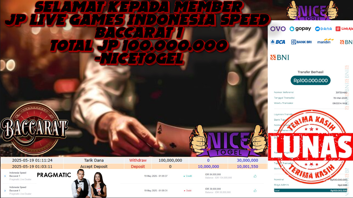 selamat kepada User id : hokiar* Telah berhasil mendapatkan kemenangan besar pada permainan LIVE GAMES INDONESIA SPEED BACARAT 1 Dengan kemenangan Sebesar Rp.100.000.000,- Setelah mengisi formulir withdraw dengan kurung waktu hanya 5 – 10 menit pihak NICETOGEL sudah melakukan transfer kepada pemilik Userid dan dana sudah dapat di cairkan oleh pemenang. Bukti pembayaran yang kami berikan merupakan bukti pembayaran yang SAH / VALID yang langung di dapatkan melaui tanda transfer transaksi dari Bank yang di tuju.
