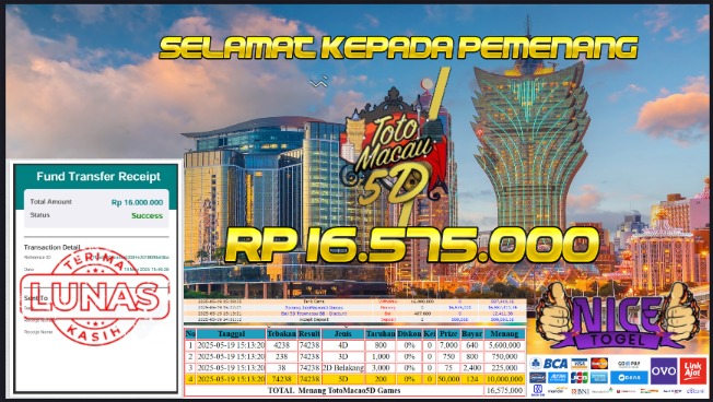 Selamat kepada member NICETOGEL User id :HAE** Telah berhasil mendapatkan kemenangan besar pada permainan TOGEL TOTO MACAU 5D Dengan kemenangan Sebesar Rp.16.575.000,- Setelah mengisi formulir withdraw dengan kurung waktu hanya 5 – 10 menit pihak NICETOGEL sudah melakukan transfer kepada pemilik Userid dan dana sudah dapat di cairkan oleh pemenang. Bukti pembayaran yang kami berikan merupakan bukti pembayaran yang SAH / VALID yang langung di dapatkan melaui tanda transfer transaksi dari Bank yang di tuju.