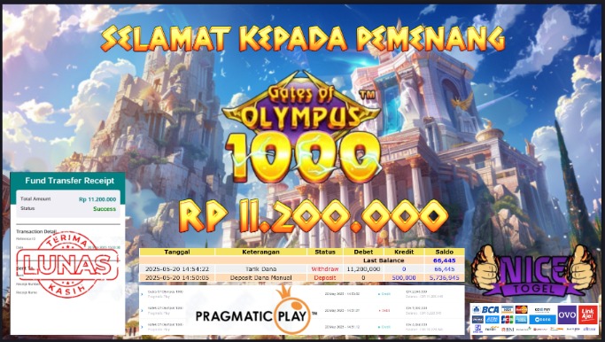 Selamat kepada member NICETOGEL User id : KDK** Telah berhasil mendapatkan kemenangan besar pada permainan SLOT GATES OF OLYMPUS 1000 Dengan kemenangan Sebesar Rp 11.200.000,- Setelah mengisi formulir withdraw dengan kurung waktu hanya 5 – 10 menit pihak NICETOGEL sudah melakukan transfer kepada pemilik Userid dan dana sudah dapat di cairkan oleh pemenang. Bukti pembayaran yang kami berikan merupakan bukti pembayaran yang SAH / VALID yang langung di dapatkan melaui tanda transfer transaksi dari Bank yang di tuju.