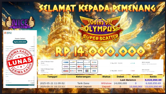 Selamat kepada member NICETOGEL User id : TRI** Telah berhasil mendapatkan kemenangan besar pada permainan SLOT GATES OF OLYMPUS SUPER SCATTER Rp Dengan kemenangan Sebesar Rp 14.000.000,- Setelah mengisi formulir withdraw dengan kurung waktu hanya 5 – 10 menit pihak NICETOGEL sudah melakukan transfer kepada pemilik Userid dan dana sudah dapat di cairkan oleh pemenang. Bukti pembayaran yang kami berikan merupakan bukti pembayaran yang SAH / VALID yang langung di dapatkan melaui tanda transfer transaksi dari Bank yang di tuju.