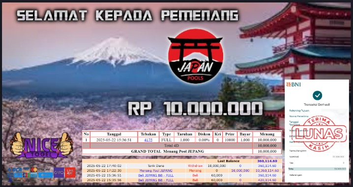Selamat kepada User id : KFGN*** Telah berhasil mendapatkan kemenangan besar pada permainan TOGEL JAPAN POOLS Dengan kemenangan Sebesar Rp.10.000.000,- Setelah mengisi formulir withdraw dengan kurung waktu hanya 5 – 10 menit pihak NICETOGEL sudah melakukan transfer kepada pemilik Userid dan dana sudah dapat di cairkan oleh pemenang. Bukti pembayaran yang kami berikan merupakan bukti pembayaran yang SAH / VALID yang langung di dapatkan melaui tanda transfer transaksi dari Bank yang di tuju.