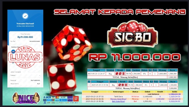 Selamat kepada User id : CFA* Telah berhasil mendapatkan kemenangan besar pada permainan LIVE MEGA SICBO Dengan kemenangan Sebesar Rp.11.000.000,- Setelah mengisi formulir withdraw dengan kurung waktu hanya 5 – 10 menit pihak NICETOGEL sudah melakukan transfer kepada pemilik Userid dan dana sudah dapat di cairkan oleh pemenang. Bukti pembayaran yang kami berikan merupakan bukti pembayaran yang SAH / VALID yang langung di dapatkan melaui tanda transfer transaksi dari Bank yang di tuju.