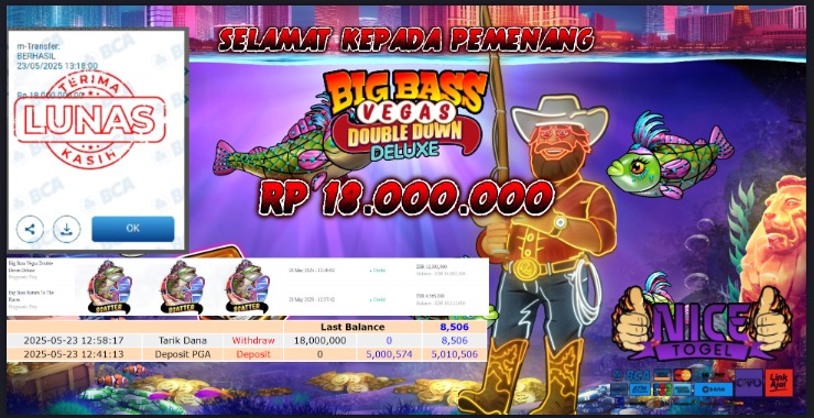Selamat kepada User id : HJS** Telah berhasil mendapatkan kemenangan besar pada permainan SLOT BIG BASS VEGAS DOUBLE DOWN DELUXE Dengan kemenangan Sebesar Rp.18.000.000,- Setelah mengisi formulir withdraw dengan kurung waktu hanya 5 – 10 menit pihak NICETOGEL sudah melakukan transfer kepada pemilik Userid dan dana sudah dapat di cairkan oleh pemenang. Bukti pembayaran yang kami berikan merupakan bukti pembayaran yang SAH / VALID yang langung di dapatkan melaui tanda transfer transaksi dari Bank yang di tuju.